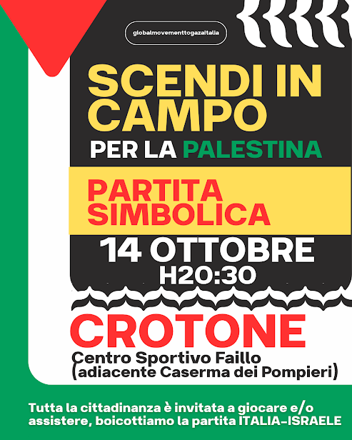 Mentre a Udine si disputerà la partita di qualificazione ai Mondiali tra Italia e Israele, anche a Crotone scenderemo simbolicamente in campo per la Palestina.