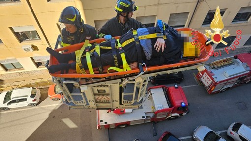 All’arrivo sul posto la squadra dei vigili del fuoco provava invano ad aprire la porta e quindi, decidevano, con ausilio dell’autoscala, di entrare dal balcone. Una volta entrati in casa i pompieri hanno aperto la porta ai medici del Suem 118 che hanno soccorso l’uomo il cui trasporto per le scale, però, era difficoltoso. Così, in collaborazione coi sanitari del 118, il ferito veniva immobilizzato e con la barella toboga assicurata all’autoscala lo si trasportava dal quarto piano sul piano stradale. Intervento alquanto delicato vista l’altezza ed il peso del ferito che veniva poi messo nell’ambulanza del Suem 118 per essere trasferito in ospedale per le cure del caso.