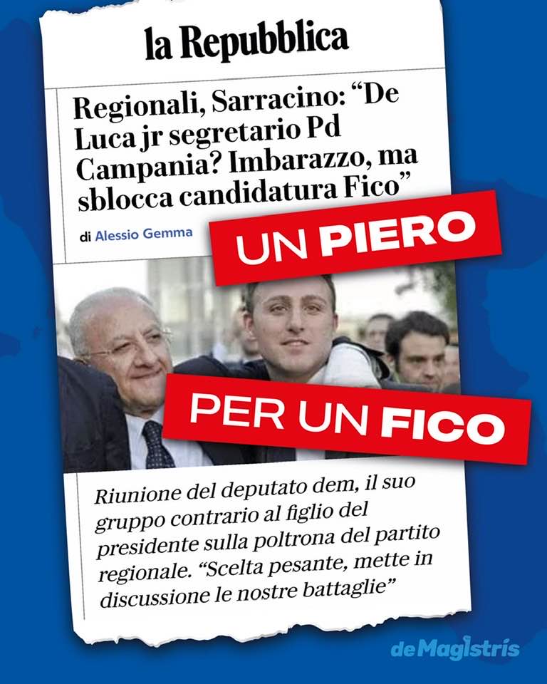 Fico: “mai con De Luca”. De Luca: “mai con Fico”. De Luca: “nonostante il PD”. Il PD: “ basta De Luca, ma senza De Luca arò jamm”. Ruotolo: “mai con De Luca”. Fico: “mai con Mastella”. Mastella: “mai con Fico”. Poi invece Fico e Mastella insieme come una pastella. Fico: “mai con Renzi”. Renzi: “con i 5S mai”. Ma in Campania andranno a braccetto. W la questione morale! W l’etica pubblica in politica! W la coerenza! Da quattro mesi per le regionali si discute solo di poltrone, sedie, divani, posti, incarichi, alleanze, famiglie, figli, posizioni personali e interessi di partito. Non si parla mai della Campania, della gente, del programma, dei problemi, delle opportunità, delle cose da fare.