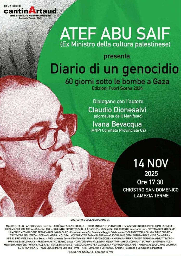 Da un’idea di CantinArtaud, e con la collaborazione e il supporto di un gran numero di associazioni e realtà attive sul territorio calabrese e nazionale, grande attesa venerdì 14 novembre alle 17:30 per l’incontro con Atef Abu Saif, ex ministro della cultura della Palestina in occasione della presentazione del suo libro “Diario di un genocidio. 60 giorni sotto le bombe a Gaza” (Fuori Scena, 2024).