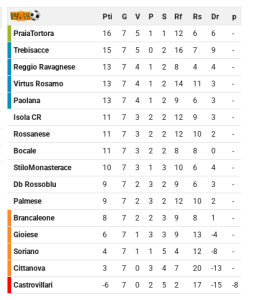 Il PraiaTortora resta al comando della classifica ma non va oltre il pareggio casalingo (0-0) contro lo StiloMonasterace. Partita ancora condizionata da un’espulsione per i biancazzurri, che sono costretti ad accontentarsi del pari al termine di una gara molto combattuta. Ma la squadra rivelazione del campionato è ormai il Trebisacce di mister Malucchi, che oggi battendo allo stadio Amerise il Brancaleone ha conquistato la quinta vittoria consecutiva ed è salito fino al secondo posto in classifica a una lunghezza dalla capolista. 3-1 il risultato finale per i giallorossi: in gol i talentuosi centrocampisti Castro e Lamberti e l’attaccante Vico. Battuta d’arresto per la Paolana, che perde 2-0 a Palmi. Torna alla vittoria la Rossanese, che passa 1-3 sul campo della Gioiese.
