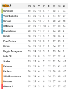 Termina a reti inviolate l’atteso derby d’alta classifica tra Vigor Lamezia e Sambiase, big match della 25^ giornata del campionato di Eccellenza. Nonostante la superiorità numerica durata un’intera frazione di gioco (espulso Trentinella al 44’) e una partita giocata, nel complesso, meglio dei giallorossi, i ragazzi di Danilo Fanello non riescono a scardinare la retroguardia ospite, rimediando un punto che lascia invariato il distacco tra le due squadre. Tornano inferiori a dieci, invece, le lunghezze dal Soriano terzo in classifica, vittorioso per 3-0 sul Gioiosa Jonica. Se il campionato fosse finito oggi, ci sarebbero stati i playoff, che invece non si disputerebbero se il vantaggio della Vigor sulla terza fosse di 10 punti. Molto bella la cornice di pubblico con due tifoserie appassionate che hanno dato spettacolo. Striscione di scherno dei tifosi della Vigor nei confronti dell’ex patron Franco Perri.