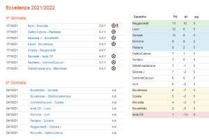 Rosicchia due punti alla capolista il Locri, che ha battuto la Bovalinese e si porta a un solo punto. A meno tre il Sersale, poi a quota nove risalgono Paolana e Morrone. I biancazzurri hanno battuto in trasferta il Gallico Catona (1-0) grazie al gol realizzato dal bomber Attilio Angotti all’11’ del primo tempo. Un contropiede perfetto innescato dal giovane talento De Chiara e finalizzato dall’esperto attaccante. La squadra di Pellicori – imbattuta dopo 5 giornate – ha poi contenuto con autorità gli attacchi dei padroni di casa ed è salito in cattedra anche il portiere Ciccio Ramunno, che dall’alto della sua esperienza è risultato decisivo per la vittoria dei tirrenici. E’ il secondo successo stagionale per la Paolana, primo in trasferta, che spegne sul nascere qualche polemica dopo il pari casalingo con l’Acri.