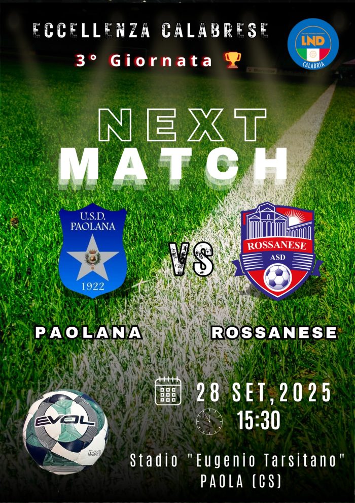 Domani al Tarsitano di Paola il derby dei Due Mari contro la Rossanese è il match-clou della terza giornata. La Paolana proverà l’operazione sorpasso mentre i rossoblù vorranno continuare il filotto vincente. Le due squadre hanno giocato in settimana la gara di andata della Coppa Italia e hanno perso entrambe: la Paolana 3-2 in casa del PraiaTortora e la Rossanese in casa 0-1 con la DB Luzzi. Ma hanno schierato molte riserve proprio in previsione della gara di domani. Unica nota stonata sarà l’assenza dei tifosi della Rossanese, bloccati dal divieto della Prefettura dopo gli incidenti della partita dello scorso anno al Tarsitano.