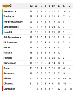 Nel campionato di Eccellenza continua il dominio assoluto di PraiaTortora e Trebisacce, che continuano a marciare a ritmi impressionati. Capolista a quota 29, jonici a 28 con vantaggio immutato sulla ReggioRavagnese, che sale a 25. Oggi ancora due vittorie per le due battistrada e per giunta fuori casa. I biancazzurri hanno espugnato il Tarsitano di Paola (0-3) mentre i giallorossi sono passati al Lo Presti di Palmi (2-4).