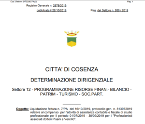 Intanto, per non saper né leggere e né scrivere, come dicono quelli bravi, vi diamo conto della determina di liquidazione a favore dei Professionisti associati di cui sopra. L’importo è di 9 mila euro ma non è quello che ci interessa. Vorremmo che i cosentini capissero che il 22 ottobre 2019, a pochi giorni dalla dichiarazione ufficiale di dissesto del Comune di Cosenza, il cazzaro ha fatto firmare in fratta e furia ad uno dei dirigenti che dovrà andar via dopo il consiglio comunale di inizio novembre (Giuseppe uomo-zainetto Nardi) questa fruttuosa determina, che alla fine paghiamo noi cosentini. Mentre le stelle – come al solito – stanno a guardare… E a Palazzo Salfi c’è sempre la banda di Occhiuto che comanda.