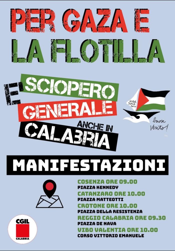 La Cgil ha proclamato lo sciopero generale per oggi venerdì 3 ottobre. Sono previste manifestazioni in tutte le città calabresi. A Cosenza in piazza Kennedy, a Catanzaro in piazza Matteotti, a Crotone in piazza della Resistenza, a Reggio Calabria in piazza De Nava e a Vibo Valentia in corso Vittorio Emanuele.