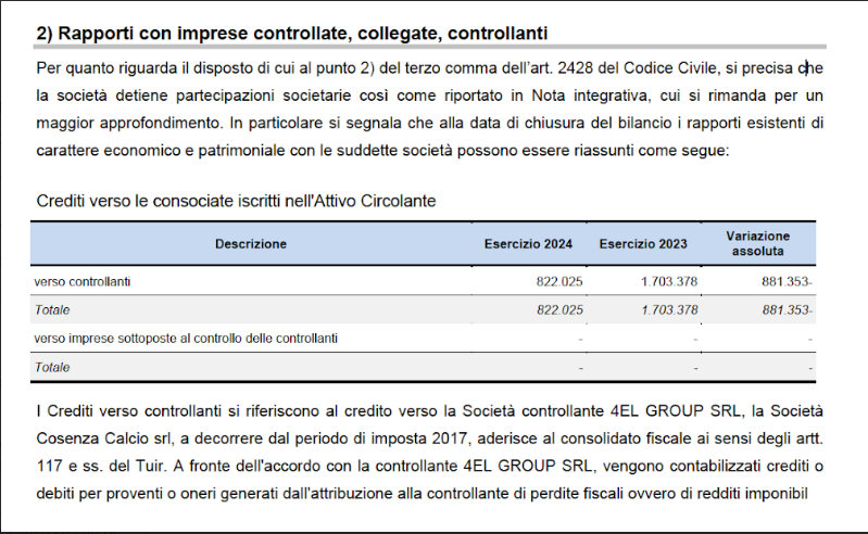 Nella “Relazione sulla gestione, Bilancio Ordinario al 31/12/2024” troviamo scritto: “Permane una situazione di relativa criticità con il Comune di Cosenza poiché a fronte di notevoli esborsi finanziari sostenuti dalla Società per far fronte alle disposizioni della lega in materia di adeguamento della struttura sportiva, non si è ancora avuto riscontro circa i rimborsi degli stessi come espressamente previsto dalla convenzione siglata con lo stesso Ente.”
