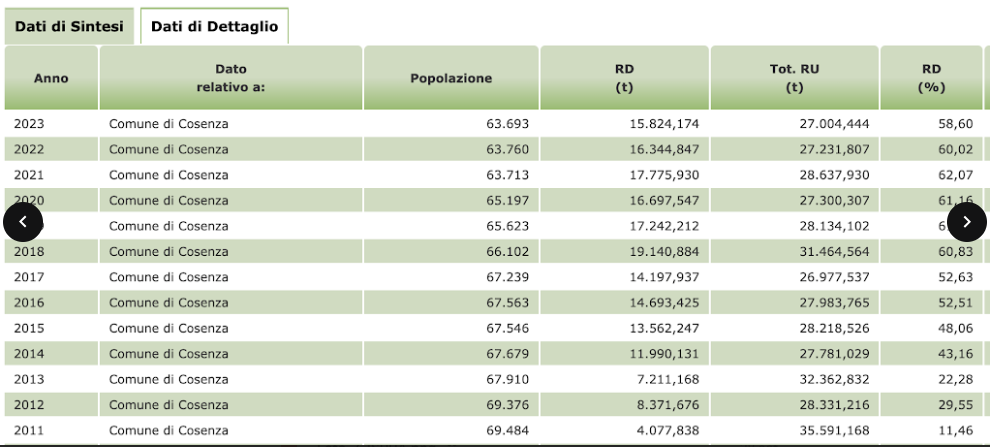 I dati ufficiali della Raccolta Differenziata (RD) sono reperibili presso il Catasto Nazionale dei Rifiuti, vengono aggiornati alla fine di ogni anno, secondo l’effettivo quantitativo di raccolta dell’anno precedente. Per capirci, in questo mese di ottobre/novembre 2025 saranno pubblicati i dati riferiti al 2024. Intanto è possibile apprendere che la RD nel Comune di Cosenza, ha raggiunto, nel 2020 il 61,16%; nel 2021 il 62,07%; nel 2022 il 60,02%; nel 2023 il 58,60%. (https://www.catasto-rifiuti.isprambiente.it/index.php?pg=detComune&aa=2023®idb=18&nomereg=Calabria&providb=078&nomeprov=Cosenza®id=18078045&nomecom=Cosenza&cerca=cerca&&p=1&width=1920&height=1080)