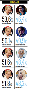 È QUESTO l’elemento di riflessione fondamentale per il “campo largo”, sfogliando i numeri: la distanza tra Conte e Schlein, nello stesso schema di voto diretto, è molto netta. Contro la segretaria del Pd, Meloni vincerebbe 53,6 a 46,4%.