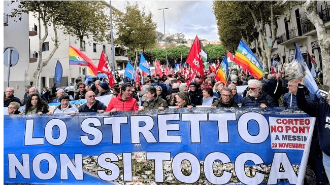 Il parlamentare di Avs Angelo Bonelli che partecipa alla manifestazione ha detto: «Salvini voleva sottrarre 14 miliardi di euro per le vere priorità del Paese. Un progetto vecchio di oltre trent’anni lo voleva spacciare per nuovo. Il pilone di Cannitello sta sulla faglia attiva, hanno violato e direttive europee, erano così arroganti che pensavano di poter fare quello che volevano. Oggi siamo qui per dire anche in nome del popolo italiano che un’altra Italia è possibile, perché anche la Sicilia, la Calabria hanno bisogno di ferrovie, scuole, ospedali. Questa è una manifestazione del popolo del Sud che è stato ingannato da Salvini».