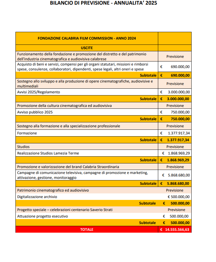 Il dato impressionante che si può vedere dal quadro riassuntivo che pubblichiamo sopra è che su un bilancio previsionale del 2025 di circa 15 milioni quasi la metà sono investiti (?) in campagne promozionali e di pubblicità. Il sostegno alle opere cinematografie si ferma a tre milioni di euro, un quinto del totale. Per il funzionamento della Fondazione, che è alloggiata presso la Regione Calabria, si sono spesi 690 mila euro. Forse un po’ troppi per una fondazione che non ha dipendenti.