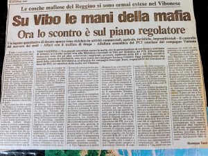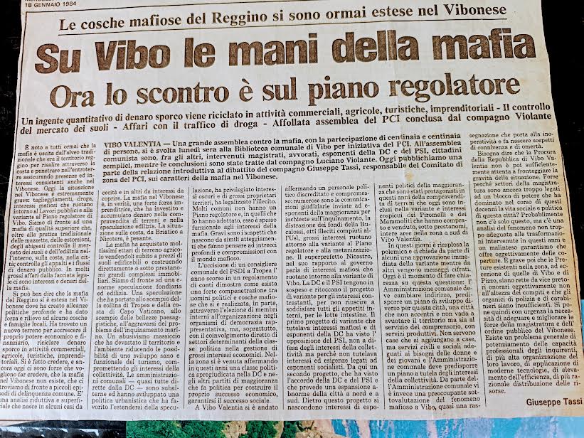 Come dice il procuratore Falvo allora la vulgata era che la mafia non esistesse, il Vibonese era un’isola felice e tranquilla. Si decise di affrontare il problema con forza in una iniziativa a carattere regionale svolta il 16 gennaio alla presenza di Luciano Violante, allora molto combattivo e fermo. Nella foto c’è l’articolo apparso su l’Unità che riporta parte della mia relazione come responsabile di zona del PCI.