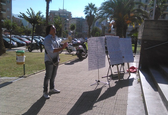 Davanti all’ingresso del tribunale, munito di megafono e cartelli esplicativi ha raccontato in breve la sua storia e quella di alcuni suoi concittadini: