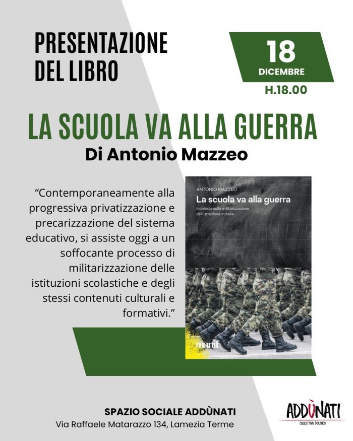 Giovedì 18 dicembre Antonio Mazzeo sarà ospite allo Spazio Sociale Addùnati per presentare il suo libro “la scuola va alla guerra. Inchiesta sulla militarizzazione dell’istruzione in Italia”, edito da Manifestolibri.