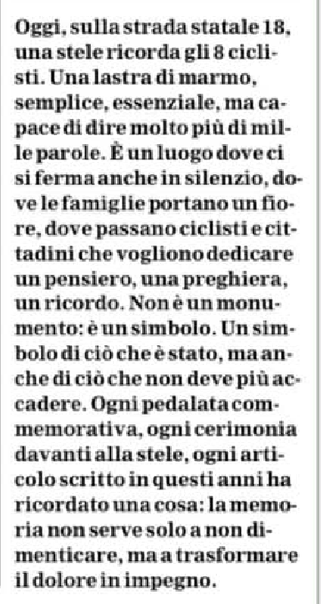 Quindici anni dopo. Le otto vite spezzate che la città non smetterà mai di ricordare. Ci sono date che segnano per sempre la storia di una comunità. Il 5 dicembre 2010 è una di quelle che Lamezia non può, e non potrà mai, dimenticare. A ricordare quanto avvenuto il familiare di una delle vittime, che ha tracciato il profilo anche degli 8 ciclisti. Era un giorno d’inverno, cielo sereno, la domenica scorre con quella calma discreta che precede il Natale. Poi la tragedia. Improvvisa, violenta, ingiusta da diventare una ferita collettiva, marchiata nella memoria di tutti. Sulla Statale 18, in località Marinella, 8 ciclisti lametini, amici, uomini perbene, padri di famiglia, lavoratori, sportivi appassionati, vennero travolti da un’auto guidata da un giovane privo di patente e risultato positivo all’uso di sostanze stupefacenti. Una morte assurda, brutale, che privò Lamezia di figure amate e stimate. Ricordarli non significa ripetere dei nomi, ma restituire dignità a ciò che rappresentavano: 8 vite e storie interrotte. ROSARIO PERRI – FRANCESCO STRANGES -VINICIO PUPPIO – GIOVANNI CANNIZZARO – PASQUALE DE LUCA – FORTUNATO BERNARDI – DOMENICO PALAZZO – DOMENICO STRANGES . Fonte: Gazzetta del Sud