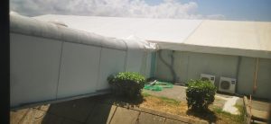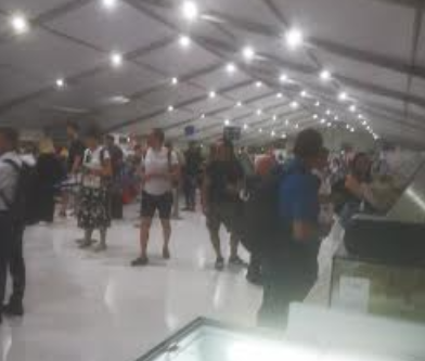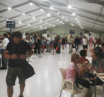 Sembra di scendere nell’inferno dantesco, lasciate ogni speranza o voi che entrate, ti investe un’aria calda e un frastuono assordante. Nonostante i condizionatori d’area inseriti ad ogni dove che sparano area fredda a tutto andare e a piena velocità, nulla possono fare contro il sole rovente che surriscalda il tendone rendendo l’area soffocante e a volte irrespirabile. A questo si unisce, si frappone e si mischia il vociare assordante e il rumore degli aerei che vanno a parcheggiare a poche centinaia di metri dalla struttura. E mi immagino d’inverno con la pioggia e con il vento.