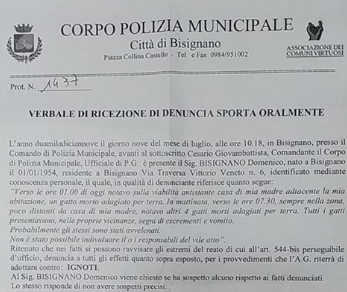 Denuncia presso la polizia municipale e segnalazione alla protezione animali sono stati effettuati giorno 9 luglio, al rinvenimento dei primi gatti morti.