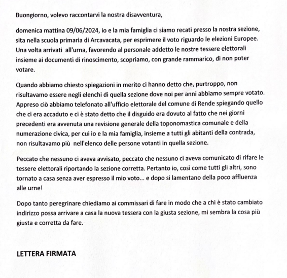 POLITICA Lettere a Iacchite’: “Rende, vi raccontiamo la nostra disavventura alla sezione della scuola primaria di Arcavacata” Da Iacchite - 9 Giugno 2024 FacebookTwitterPinterestWhatsApp Di seguito, riceviamo e pubblichiamo una lettera di protesta riguardante il voto di oggi a Rende per le Europee.