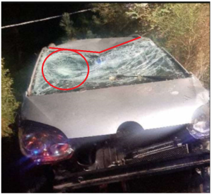 Non bisogna essere degli esperti in sinistri stradali per capire l’assurdità di questa versione. Ilaria non era alla guida dell’auto, e non può essere altrimenti. Il suo corpo viene trovato proprio all’imbocco del sentiero sterrato, e questo significa che Ilaria non è sbalzata fuori dall’auto causa cappottamento, dato che l’auto viene ritrovata 50 metri più avanti cappottata. Ilaria “esce” dall’auto prima che la stessa cappotti, ammesso che sia così, e dal lato passeggeri non certo da lato guida. E nonostante l’auto cappotti, senza che nessuno specifichi quante giravolte ha effettuato, il tetto dell’auto risulta danneggiato solo nella parte anteriore. Il che risulta molto strano: generalmente il tetto di un’auto ribaltata presenta danni su tutta la sua superfice. Per non parlare del cofano motore dell’auto intatto. Possibile che il cofano di un’auto che si ribalta tra sterpaglie, pietre, radici, non riporti neanche un graffio? E poi come è possibile che il parabrezza non sia andato in frantumi quando l’auto atterra violentemente sul terreno capovolta? Le lesioni sul parabrezza parlano chiaro: è stato l’impatto con un “oggetto” esterno a provocarle.