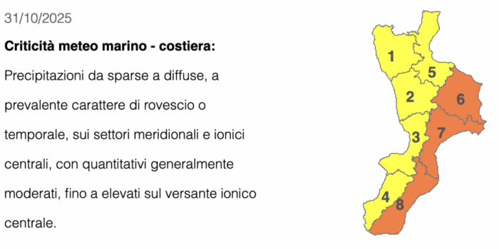 Una nuova perturbazione atlantica in arrivo dal Mediterraneo occidentale porterà piogge intense e temporali sulla Calabria a partire dalla tarda serata di oggi, 30 ottobre. I fenomeni più significativi sono attesi lungo i settori ionici centro-meridionali, dove si prevedono accumuli superiori ai 100 millimetri in 12 ore nella giornata di domani, 31 ottobre. Sul resto del territorio regionale si attendono rovesci e temporali sparsi, di minore intensità.