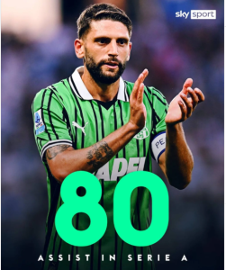Con il passaggio vincente di ieri per Laurienté in Sassuolo-Udinese 3-1, Domenico Berardi – com’è apparso anche nella diretta di Dazn – raggiunge quota 80 e sale al terzo posto – a pari merito con Marek Hamsik – nella classifica generale degli assist in Serie A (partendo dalla stagione 2004/2005), dietro solo a Francesco Totti (92) e Antonio Candreva (85). Mimmo non si discute, Mimmo si ama