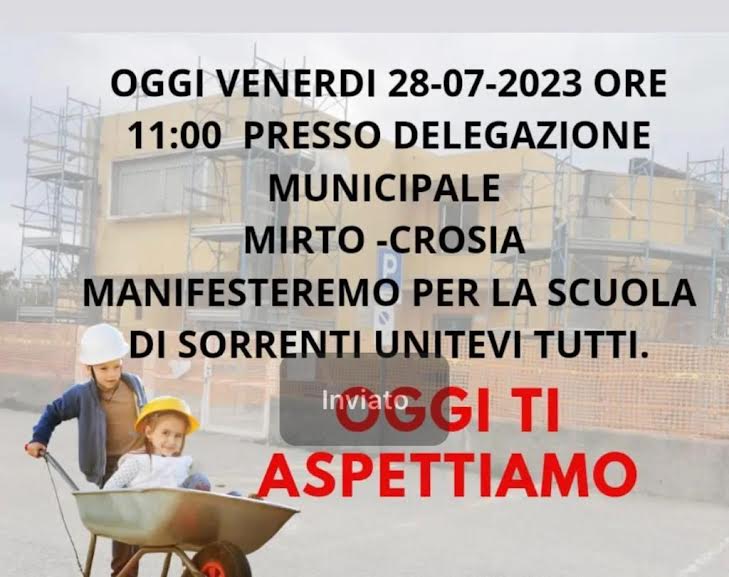 Da diverso tempo i bambini di Sorrenti, frazione di Mirto Crosia, sono costretti a frequentare la scuola in un oratorio messo a disposizione di un parroco (a sue spese) in un oratorio. Una delle acuole primarie del paese è chiusa da orami oltre 1 anno per problemi di sicurezza e i lavori di ristrutturazione sono a rilento. Il sindaco di Crosia, Antonio Russo, aveva promesso di riaprire la scuola entro pochi mesi dai lavori, ma non ha mantenuto la parola.