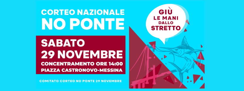 Un unico fronte di lotta contro la grande infrastruttura farlocca del Ponte sullo Stretto, con più anime che lo sostengono: concentramento domani sabato 29 novembre a Messina alle ore 14 in Piazza Castronovo. È la prima volta che il corteo affronta questo percorso cittadino lungo tutta la Via Garibaldi. Due finali: Piazza Duomo con comizi conclusivi, e Piazza Municipio, con concerti e performance fino a sera. In un incontro con la stampa, l’assemblea No ponte ha illustrato e motivato l’iniziativa che si concluderà a Piazza Municipio, raccogliendo le adesioni di tante realtà anche oltre la Sicilia: “Il sud unito contro il ponte”.