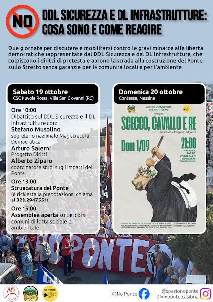 Sabato 19, a Villa San Giovanni, presso il CSC Nuvola Rossa, dalle 10,30 si terrà un’assemblea in presenza del PM Stefano Musolino (segretario nazionale di Magistratura Democratica), Arturo Salerni, legale del Progetto Diritti, e Alberto Ziparo, ingegnere dell’Università di Firenze e coordinatore degli studi sull’impatto del Ponte. Nel pomeriggio, dalle 15, l’assemblea sarà aperta alle realtà calabresi e siciliane di lotta sociale e ambientale per immaginare e definire le prossime tappe del percorso di contrasto al Ponte. Domenica 20, al villaggio UNRRA di Contesse (Messina), alle 18,30 andrà invece in scena lo spettacolo teatrale “Scecco, Cavallo e Re”, una spietata riflessione sull’inganno del potere.