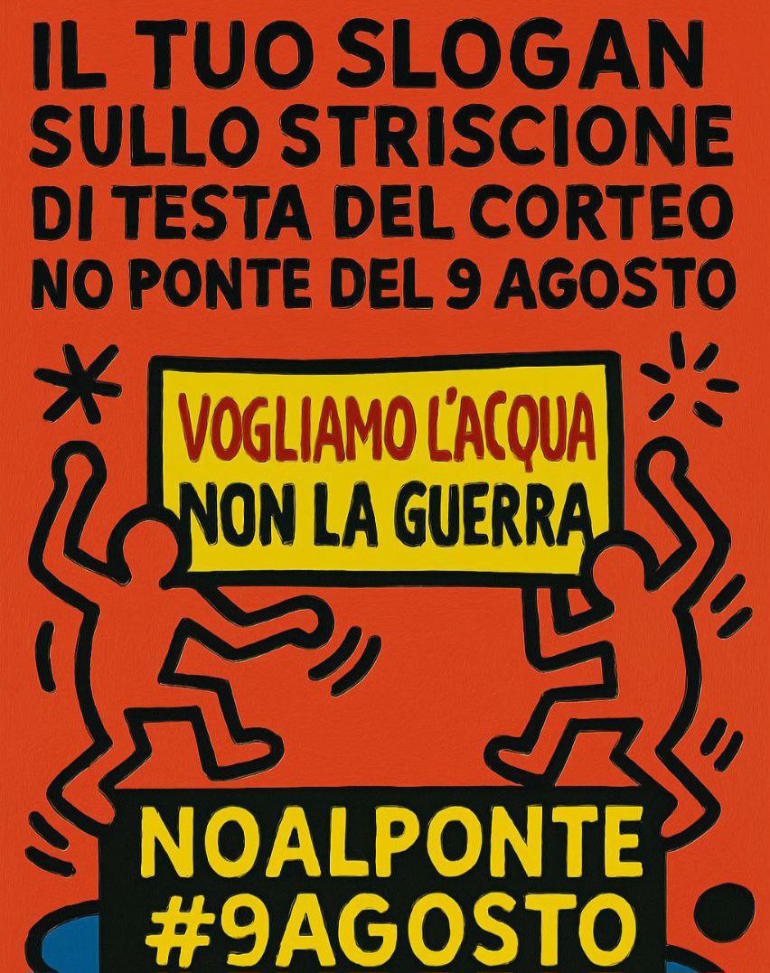 IL TUO SLOGAN SULLO STRISCIONE DI TESTA DEL CORTEO NO PONTE DEL 9 AGOSTO! “Vogliamo l’acqua non la guerra” 🎨