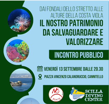 Si terrà oggi venerdì 13 settembre a partire dalle ore 20.30 presso Piazza Calandruccio a Cannitello l’incontro pubblico “Dai fondali dello Stretto alle alture della Costa Viola – Il nostro patrimonio da salvaguardare e valorizzare”, promosso dal movimento No Ponte Calabria e dallo Scilla Diving Center.
