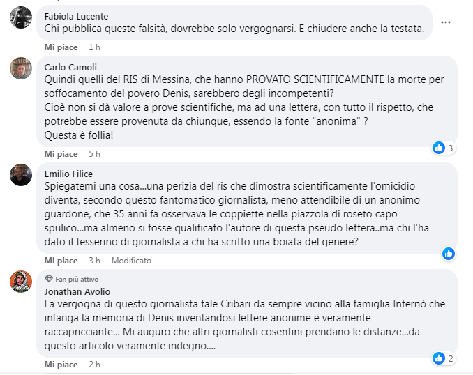 Questa lettera era indirizzata al giornalista della Rai calabrese Santi Trimboli, che stava seguendo attivamente il caso. Trimboli – che è stato contattato nella giornata di ieri da alcuni cronisti – ha riferito di averla letta, di averla considerata assolutamente inattendibile e di averla consegnata al pm che aveva in mano le indagini, Ottavio Abbate. Questa lettera era così assurda che neanche i legali della difesa di Internò l’hanno mai tirata fuori nel corso del processo salvo rispolverarla adesso affinché il giornalista di famiglia potesse divulgarla suscitando l’ira e la rabbia di migliaia di cosentini.