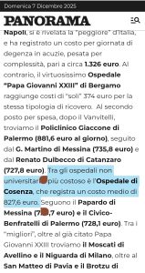 Tra tutti gli ospedali non universitari d’Italia, quello di Cosenza risulta il più costoso in assoluto: una giornata di degenza in acuzie (fase acuta) arriva a costare in media 827,6 euro. Un primato negativo che mette la struttura in cima alla lista delle peggiori performance economiche del Paese.