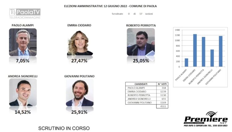 A Paola siamo a metà dello spoglio (circa 4.500 voti scrutinati) e secondo i dati diffusi da Paola TV in testa c’è Emira Ciodaro col 27,47 per cento mentre alle sue spalle è bagarre tra Giovanni Politano e il sindaco uscente Roberto Perrotta. Ormai certo il ballottaggio ma estrema incertezza su chi andrebbe al secondo turno dietro Emira Ciodaro.