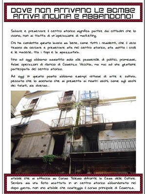 Il Comitato paragona l’intera parte vecchia di Cosenza ad un luogo sopravvissuto ai bombardamenti, dove sembra di vivere nei tempi del dopoguerra. “Dove non arrivano le bombe, arriva incuria e abbandono”, proprio con questo titolo, l’opuscolo fotografico mostra lo stato di degrado dei quartieri e piazze del centro storico e la voglia dei residenti di “riprendere in mano la propria vita e gli spazi in cui questa si svolge”.