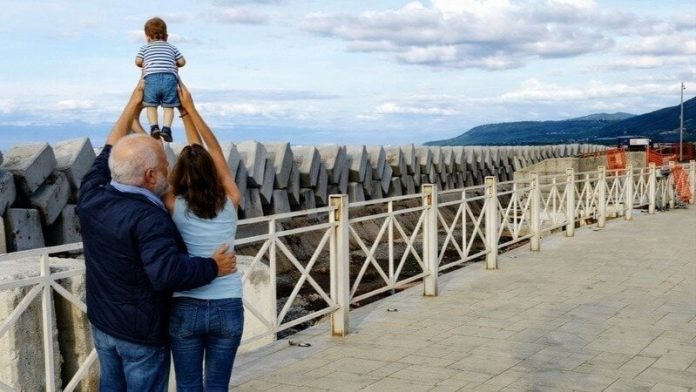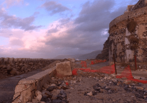L’ingombro visivo reale dell’intervento appare inoltre ben superiore e ben diverso rispetto a quello restituito dalle viste progettuali post operam, nelle quali l’impatto della scogliera risulta invece fortemente mitigato. Succede così che, oggi, il rapporto tra la passeggiata, il mare e la linea di costa sia sostanzialmente alterato, con l’opera che assume un ruolo schermante e dominante rispetto al paesaggio costiero; non si cammina più tra le case e la piazza e il mare, ma tra l’abitato e un muro di cemento, che non verrà certo alleggerito dalla prevista copertura in pietra, soluzione che invece aggrava l’impatto ambientale e paesaggistico dell’opera.