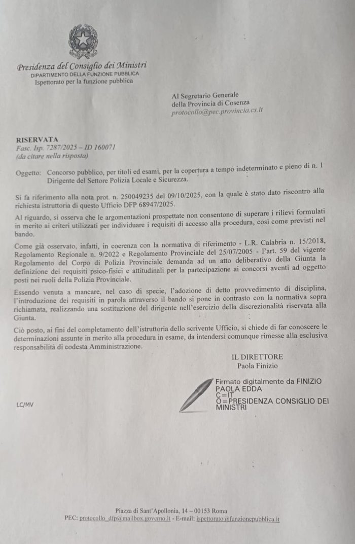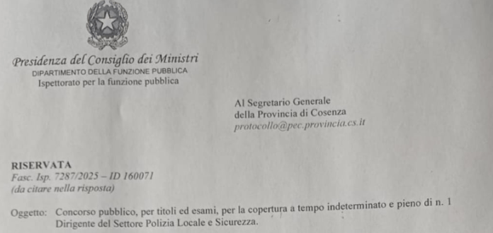 ALLA PROVINCIA DI COSENZA NONOSTANTE LA DIRETTIVA DELLA NOTA NEGATIVA SUI FALSI CONCORSI DELLA PRESIDENZA DEL CONSIGLIO DEI MINISTRI DIPARTIMENTO F.P. DELL’ISPETTORATO DELLA FUNZIONE PUBBLICA -FASC.ISP. 7287/2025- ID 160071 – NOTA PERVENUTA A QUESTO ENTE- MARCO AMBROGIO & ROSARIA SUCCURRO CONTINUANO A IGNORARLA – FUORI DA OGNI LOGICA LEGISLATIVA.