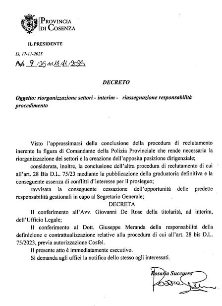 L’esempio lampante è quello che vi mostriamo oggi, vale a dire il conferimento dell’incarico ad interim al fido Giovanni De Rose, di stretta osservanza occhiutiana, dell’Ufficio… Legale. Siamo davanti ad una truffa bella e buona e infatti la firma in calce a questa pagliacciata è della Succurro e non del segretario Alfonso Rende, che si guarda bene dal firmare queste vergogne.