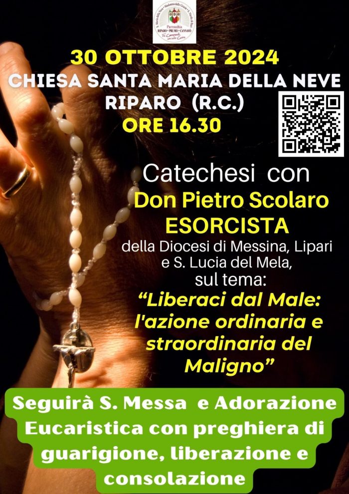 Riparo Cannavò, 23 ottobre 2024. Il 30 ottobre 2024, alle ore 16.30, si svolgerà un incontro di catechesi di grande rilevanza spirituale presso la Chiesa Santa Maria della Neve a Riparo Cannavò nella periferia di Reggio Calabria. L’evento vedrà la partecipazione di Don Pietro Scolaro, esorcista della Diocesi di Messina, Lipari e S. Lucia del Mela, nonché autore del libro “Liberaci dal maligno. Teologia e pastorale di demonologia”.