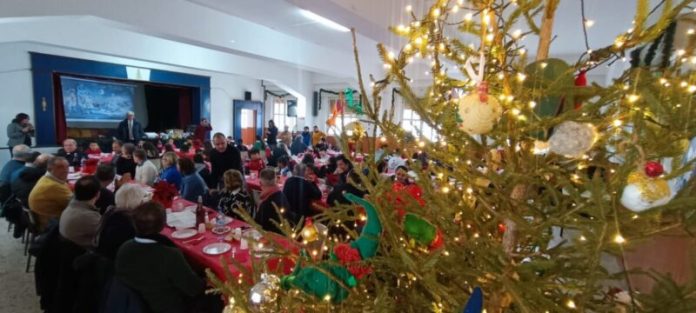 Cinque lunghe tavolate rosse addobbate a festa con oltre cento posti a sedere, le melodie del Natale in sottofondo e il profumo di funghi, salsiccia e patate che rapisce i sensi e inebria i numerosi ospiti.