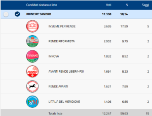 Cinque seggi a Insieme per Rende e due a testa per le altre cinque liste che hanno sostenuto la battaglia elettorale di Sandro Principe. La lista di riferimento di Principe, la “vecchia” Insieme per Rende, ha macinato voti e con 3.695 voti ha fatto il vuoto aggiudicandosi la maggior parte dei 15 seggi a disposizione con il 17,99% di percentuale che è veramente tanta roba. Ma hanno viaggiato ad alti livelli anche le altre liste. Per quanto riguarda le opposizioni, 5 seggi al centrodestra (4+Ghionna), 3 al centrosinistra (2+Bilotti) e uno al M5s (Gallo).