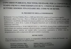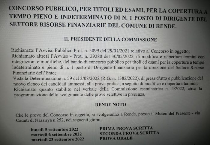 Sembra che il 5 e 6 settembre scorso siano state svolte le prove scritte del famoso concorso per dirigente finanziario (per maggiore chiarezza: quello destinato a Infantino-vedi vostro articolo del 12/07/22 https://www.iacchite.blog/lettere-a-iacchite-rende-rinviato-il-concorso-per-infantino-ha-il-covid/). La cosa strana è che nell’avviso pubblicato col calendario delle prove scritte (si veda in allegato), hanno stabilito che la prova orale si svolgerà il 23/09/22; cioè senza tenere conto di quanti candidati avrebbero partecipato al concorso e di quanto tempo fosse necessario per la correzione delle due prove scritte, hanno già fissato la seduta per la prova orale.
