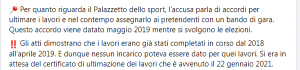 Dunque, la tesi secondo la quale Manna e i suoi compari non avrebbero potuto inciuciare con i loro sodali del Palasport Europa in campagna elettorale perché i lavori erano già assegnati l’anno prima e addirittura finiti (quando ancora non erano manco iniziati!) è una grandissima balla. Per un semplice motivo: il suggeritore di Marcello Mazzetta o lui stesso, in preda ad un attacco di amnesia, urla con tutto il fiato che ha in corpo che loro, ad aprile 2019, avevano già finito tutto e quindi avevano portato a termine le procedure con largo anticipo rispetto alla campagna elettorale e invece i fatti – prodotti da loro stessi peraltro – li smentiscono clamorosamente, dal momento che i lavori sono iniziati soltanto il 3 aprile 2019, a poche settimane dalle elezioni comunali. E il contratto d’appalto è stato siglato addirittura il 16 maggio, soltanto dieci giorni prima del turno elettorale. Per come potete leggere voi stessi qui sopra. Contemporaneamente, tanto per farvi capire di cosa parliamo, Marcello Manna inaugurava un supermercato Lidl e il famigerato Parco Acquatico con l’assunzione sbandierata di decine e decine di persone.