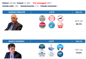 Sandro Principe sta per tornare sindaco di Rende. Quando sono stati conteggiati 3.497 voti, il suo vantaggio sugli avversari è nettissimo. Principe è attestato a 2.021 voti pari al 58,89% mentre il candidato del centrodestra Ghionna con 653 voti è al 19,03% e il candidato Bilotti è terzo con 507 voti pari al 14,33%. I sostenitori di Principe, nella segreteria elettorale, sono molto distesi e si preparano ai festeggiamenti. Sandro Principe è tornato alla ribalta soprattutto grazie al referendum sulla città unica di Cosenza indetto dalla Regione e risoltosi con un clamoroso successo dei No trascinati proprio dalla città di Rende e dall’impegno in tal senso del leader socialista. Un risultato che era prevedibile ma che forse non era scontato con questo distacco. AGGIORNAMENTO SU 8.500 VOTANTI