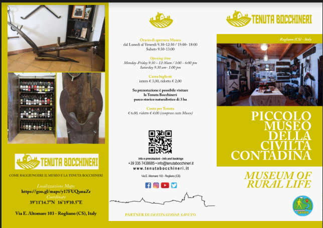 Si rammenta che il Piccolo Museo della Civiltà Contadina- Tenuta Bocchineri è un Museo diffuso caratterizzato da ambienti chiusi (tre ambienti, allestiti in due casette) e da spazi all’aperto ove sono presenti utensili/attrezzi di maggiori dimensioni. Il Piccolo Museo ha partecipato ad eventi nazionali e regionali “Musei aperti”, l’ultimo dei quali si è verificato in coincidenza con la chiusura del progetto “Alternanza Scuola Lavoro”, realizzato con L’Istituto Superiore Marconi-Guarasci di Rogliano.