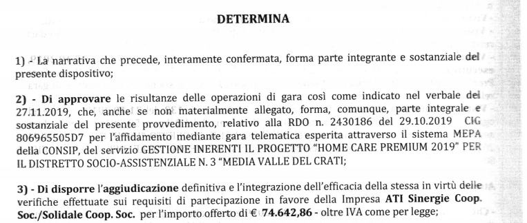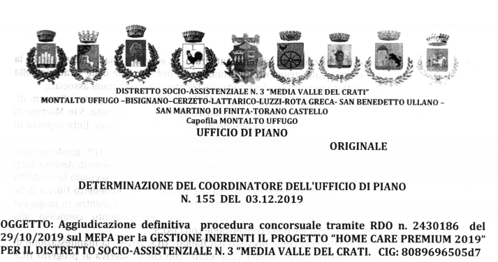 La storia nasce con la determina n. 155 del 03/12/2019 del Coordinatore dell’Ufficio di Piano  – del Distretto Socio Assistenziale n. 3 “ Media Valle del Crati” che a seguito di procedura di gara telematica attraverso il MEPA la Società Cooperativa ATI SOLIDALE/SINERGIE per l’importo di annuale di € 74.642,86 si aggiudicava l’affidamento della gestione e delle attività inerenti il progetto HCP 2019 “Home Care”, risorse economiche trasferite dall’INPS, gestite come soggetto attuatore il Comune di San Benedetto Ullano nella sua qualità di Comune Capofila.