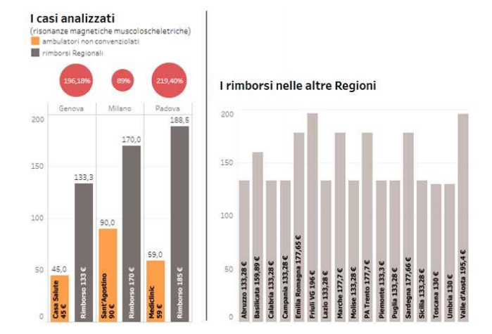 Al Sant’Agostino di Milano, che non lavora con il servizio sanitario, una risonanza magnetica muscoloscheletrica (ginocchio, spalla, mano, anca, piede) costa al cittadino che ha fretta 90 euro. Qual è il rimborso che la Lombardia garantisce ai suoi centri privati convenzionati? 169,97 euro. L’89% in più. Il numero delle prestazioni eseguite in un anno sono 168.514, quindi si potrebbero risparmiare quasi 13,5 milioni. Alla CasaSalute di Genova il costo è di 45 euro, contro i 133,28 pagati dalla Regione Liguria (196,18% in più). La Regione potrebbe quindi spendere 716.850 euro contro 2,1 milioni. Alla MediClinic di Padova si paga 59 euro contro 188,45 (219,40% in più).
