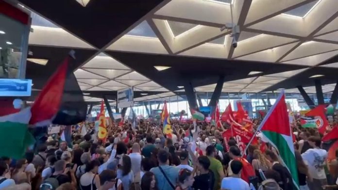In migliaia invadono la stazione di Napoli centrale durante lo sciopero generale indetto dall’Usb per Gaza e occupano i binari per circa mezz’ora, sfondata la barriera che impedisce l’ingresso ai non viaggiatori. Tante bandiere della pace. “Abbassate le armi, alzate i saluti”, è scritto sul lungo striscione. Dal megafono si scandisce: “Pagherete caro, Pagherete tutto”. Le proteste contro il governo Meloni accusato di non intervenire. Alle 11 i manifestanti lasciano la stazione di piazza Garibaldi.