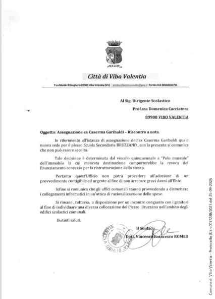 La dirigente ha chiesto 10 locali dell”Ex caserma dei carabinieri Garibaldi che fino a qualche mese fa era la sede temporanea del primo circolo di Vibo Valentia quindi già omologata a edificio scolastico. L’amministrazione ha ben pensato di chiedere un finanziamento per realizzare un un polo museale e la dirigente chiede solo 10 locali che non pregiudicherebbero l’iniziativa perché gli spazi ci sono. Nessun onere per l’ amministrazione.