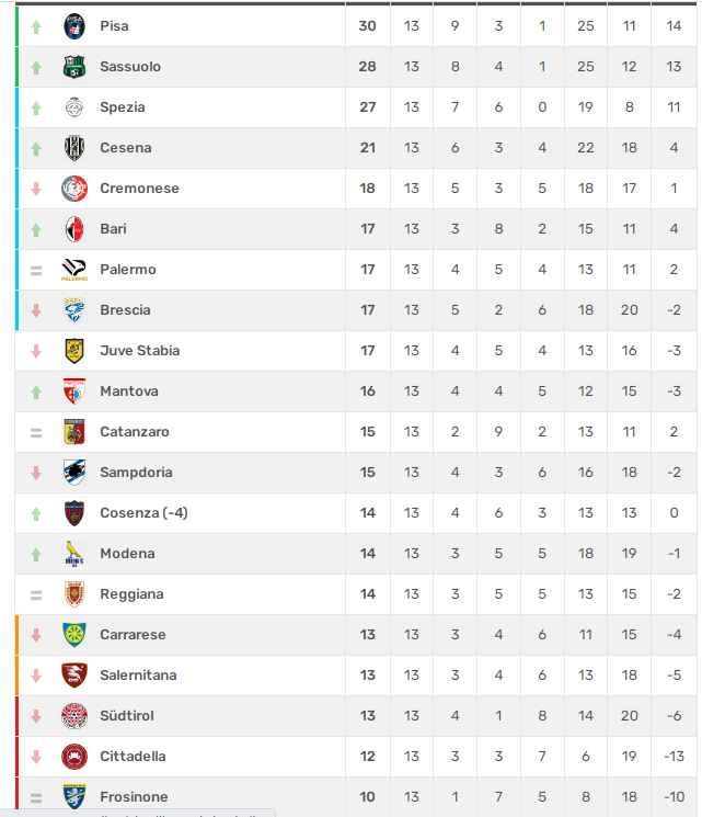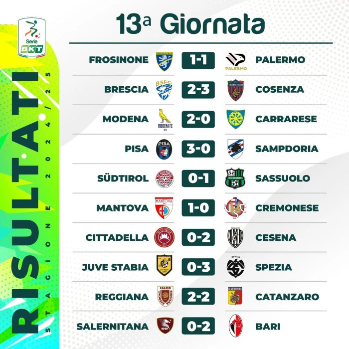 Nelle partite di domenica della 13^ giornata di B, lo Spezia va a vincere 3-0 in casa della Juve Stabia e segnano entrambi i fratelli Esposito, prima Francesco Pio poi Salvatore, nati proprio a Castellammare: la squadra di D’Angelo sempre terza da sola. Il Cesena batte in trasferta il Cittadella, in gol anche il capocannoniere Shpendi. Il Bari va a vincere in casa della Salernitana, la Reggiana pareggia 2-2 con il Catanzaro. Ieri il Pisa capolista ha battuto con un netto 3-0 la Sampdoria confermandosi in testa da solo. Successo anche per il Sassuolo in casa del Sudtirol grazie al gol di Laurentié. La Cremonese sconfitta a Mantova: decisiva la rete di Burrai. Partita pazza al Rigamonti con il Brescia sotto di due reti con il Cosenza ma capace di riagguantare il pari nell’ultimo quarto d’ora: poi al 95′ il brasiliano Charlys firma il 3-2 finale per i calabresi. Dopo l’esonero di Bisoli, è tornato a vincere il Modena che ha battuto la Carrarese. L’anticipo di venerdì tra Frosinone e Palermo si era chiuso sul pari. Tutti i risultati e i gol